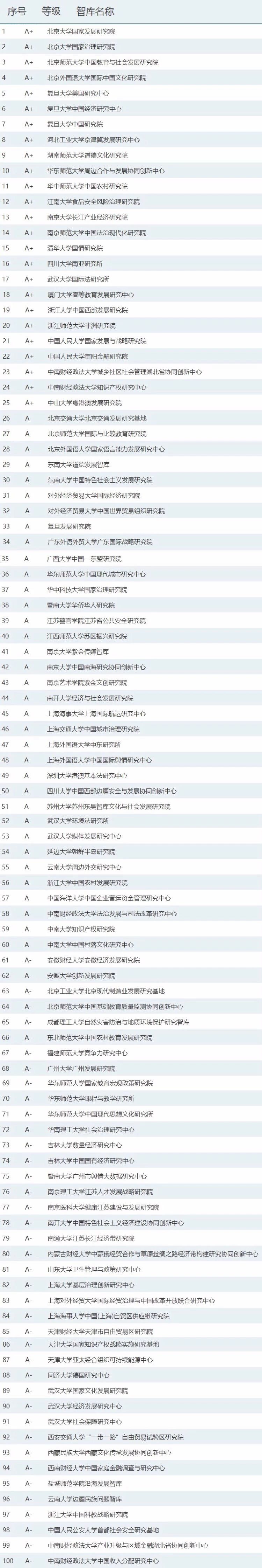 CTTI高校智库百强榜榜单按照智库名称首字母音序排列