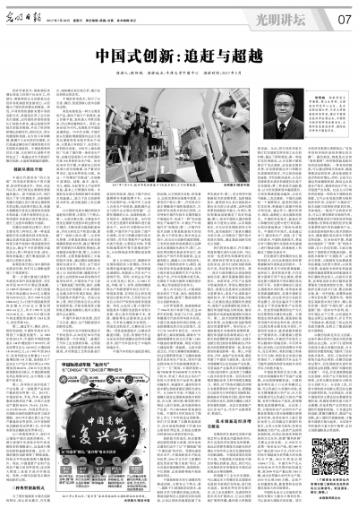 2017年2月,欧阳峣教授赴牛津大学做高级研究学者期间,在牛津大学中国中心发表了题为《中国式创新:追赶与超越》的演讲,7月30日《光明日报》的“光明讲坛”栏目用整版的篇幅刊登了这次演讲的全部内容。欧阳峣教授回顾了中国从世界先进技术的跟随者到并行者的历程,用三种有代表性的创新型式描述了中国式创新的总体状况,总结了技术追赶与超越过程中的经验和教训,并从后发优势、比较优势、大国优势、体制优势等视角进行了比较合理的解释。