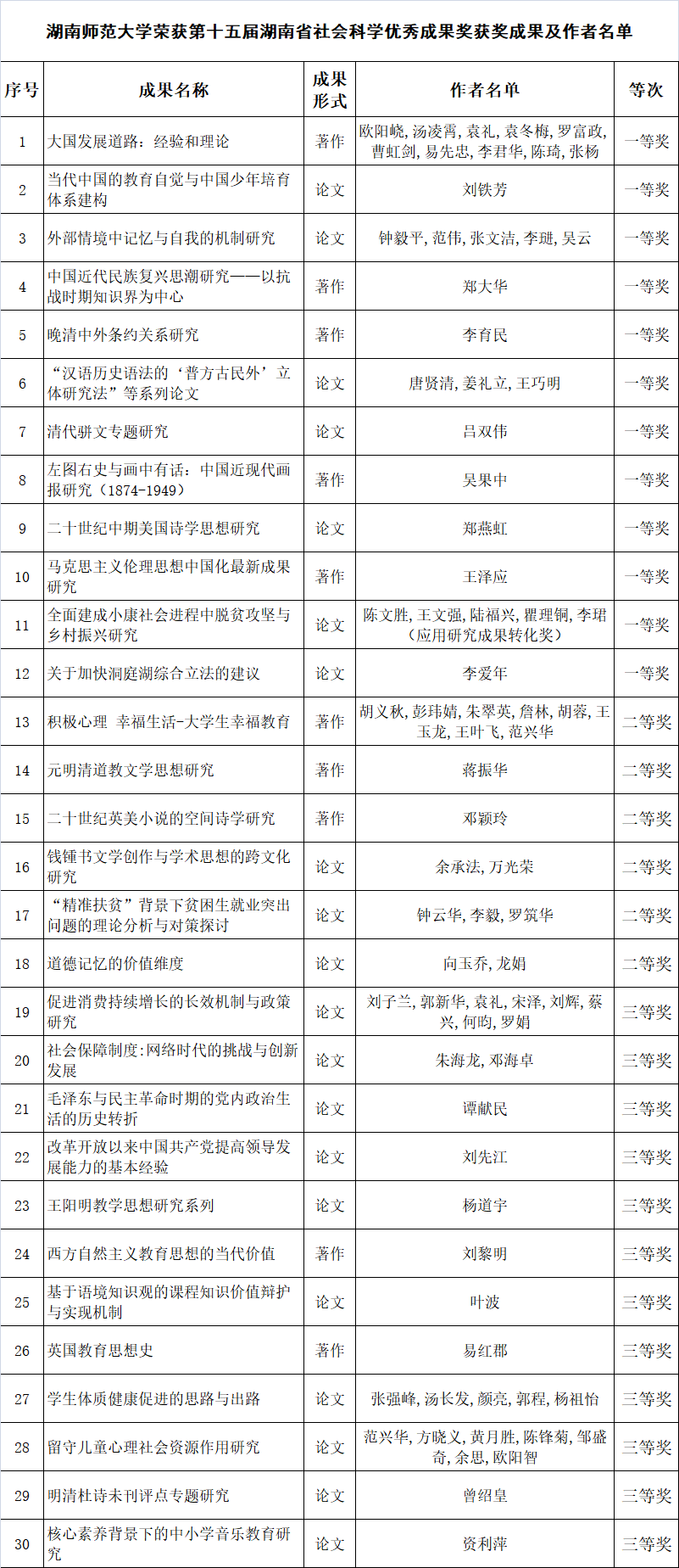 2月16日,湖南省委、省政府发布了《关于表彰湖南省社会科学奖获奖成果和专家的通报》,表彰了第十五届湖南省社会科学优秀成果奖获奖成果、第八届湖南省优秀社会科学专家和第六届湖南省优秀青年社会科学专家。