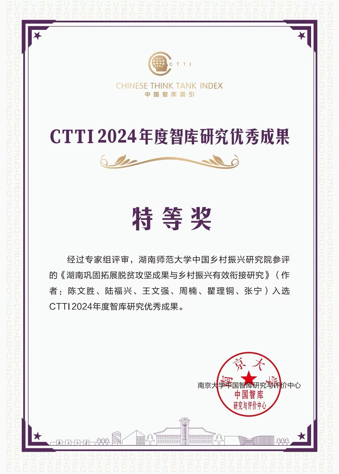 论坛发布了中国智库索引(CTTI)2024年度增补来源智库名单、2024年度智库研究优秀成果名单。湖南师范大学中国乡村振兴研究院被遴选为中国智库索引CTTI新增来源智库,推荐的《湖南巩固拓展脱贫攻坚成果与乡村振兴有效衔接研究》荣获CTTI 2024年度智库研究优秀成果特等奖;中华伦理文明研究中心推荐的《关于进一步培育我市未来产业,加快形成新质生产力的对策建议》荣获CTTI 2024年度智库研究优秀成果一等奖,《全力做好中华文明精神标识和文化精髓的提炼展示工作》荣获CTTI 2024年度智库研究优秀成果二等奖。