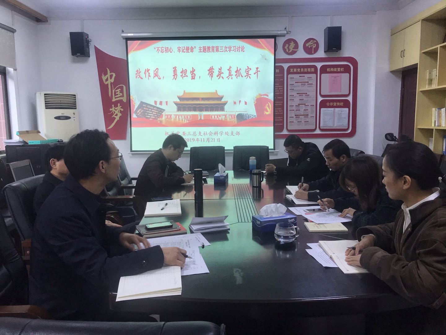 11月21日,社科处支部举行“不忘初心、牢记使命”主题教育第三次学习讨论,讨论主题为“改作风,勇担当,带头真抓实干”。